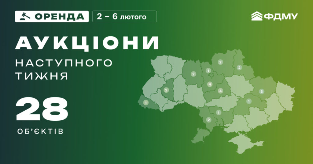 Наступного тижня, з 2 по 6 лютого, Фонд держмайна планує провести 28 аукціонів з оренди. Вони заплановані у Києві, Харківській, Одеській, Житомирській, Київській, Миколаївській, Закарпатській, Черкаській, Тернопільській, Дніпропетровській, Житомирській, Кіровоградській, …
