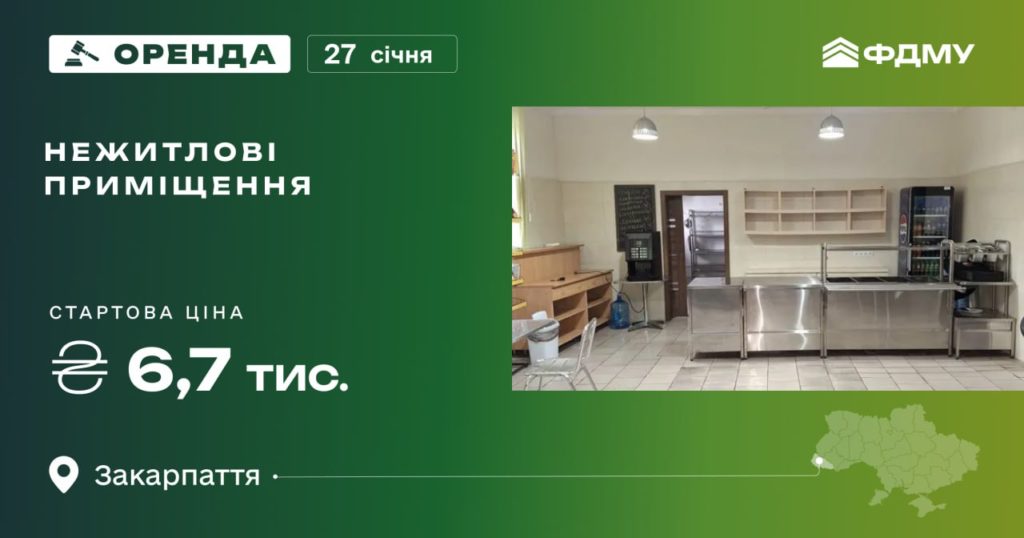 Фонд держмайна запрошує 27 січня взяти участь в аукціоні з оренди частин вбудованих приміщень підвального поверху будівлі у м. Мукачево. Стартова ціна оренди складає 6,7 тис. грн. Загальна площа активу…