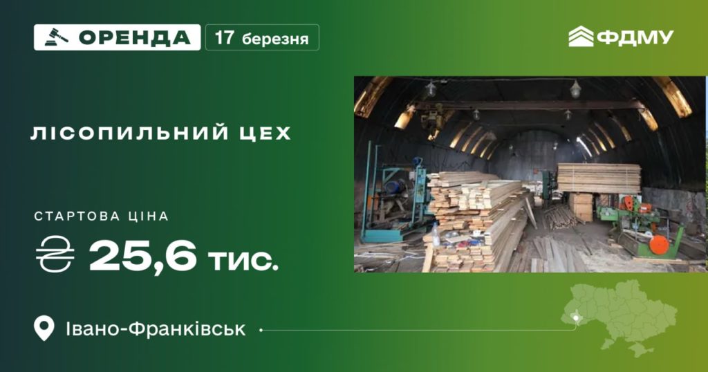 Фонд держмайна запрошує 17 березня взяти участь в аукціоні з оренди лісопильного цеху у м. Івано-Франківськ.