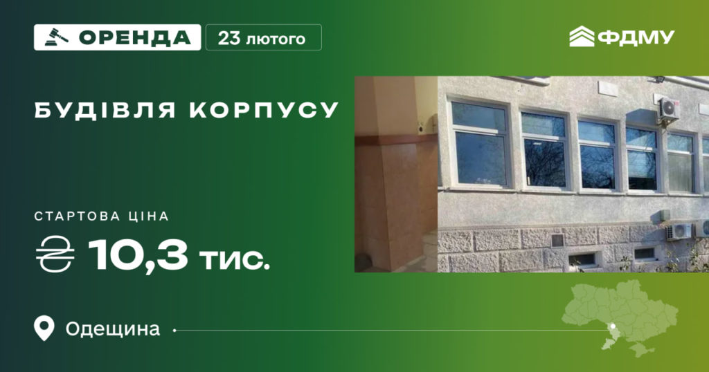Фонд держмайна запрошує 23 лютого взяти участь в аукціоні з оренди будівлі корпусу у місті Одеса.