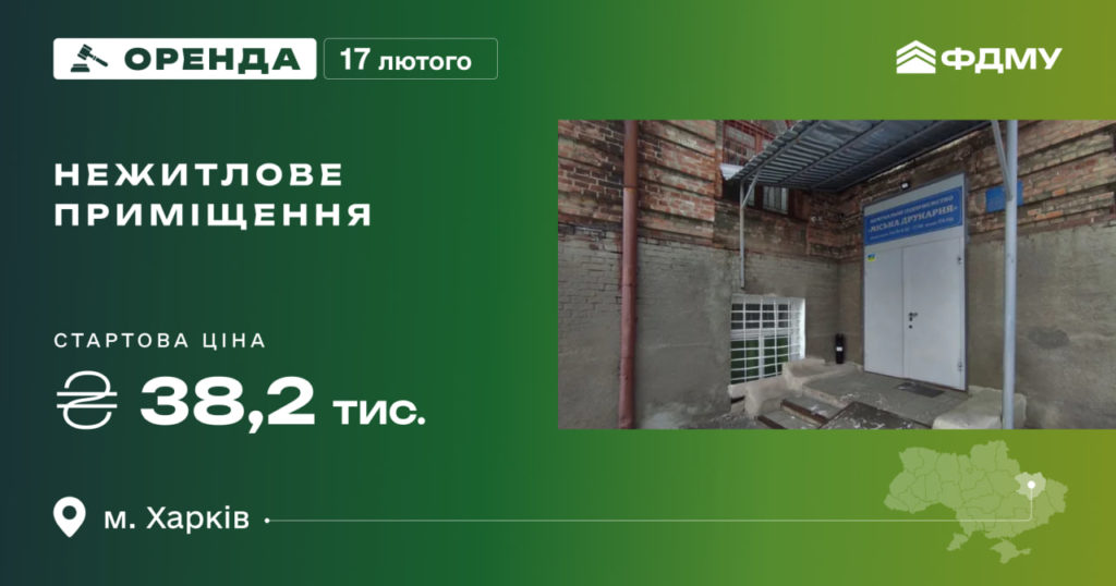 Фонд держмайна запрошує 17 лютого взяти участь в аукціоні з оренди нежитлових підвальних приміщень у Харкові.