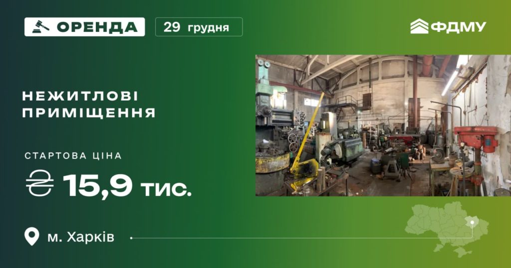 Фонд держмайна запрошує 29 грудня взяти участь в аукціоні з оренди нежитлових приміщень у Харкові.