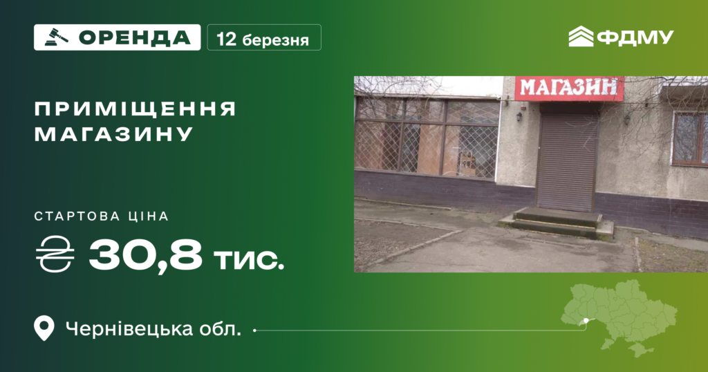 Фонд держмайна запрошує 12 березня взяти участь в аукціоні з приміщення магазину у Чернівецькій області.