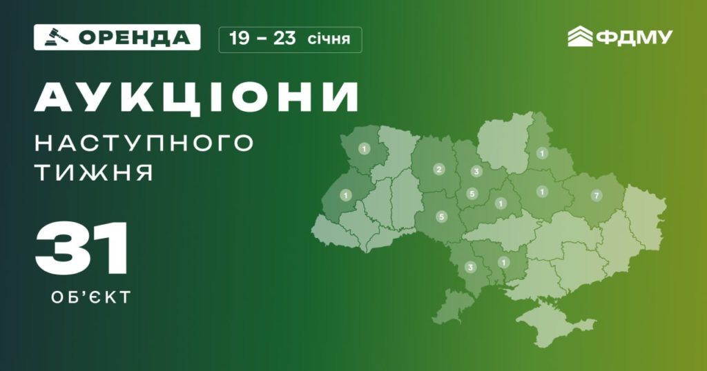 Наступного тижня, з 19 по 23 січня, Фонд держмайна планує провести 31 аукціон з оренди. Вони заплановані у Києві, Харківській, Вінницькій, Одеській, Житомирській, Київській, Волинській, Львівській, Миколаївській, Полтавській, Сумській, Черкаській областях.