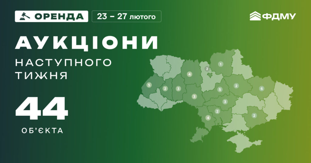 Наступного тижня, з 23 по 27 лютого, Фонд держмайна планує провести 44 аукціони з оренди. Вони заплановані у Києві, Львівській, Хмельницькій, Тернопільській, Житомирській, Вінницькі, Чернігівській, Полтавській, Кіровоградській, Одеській, Миколаївській, Харківській і Запорізькій областях.