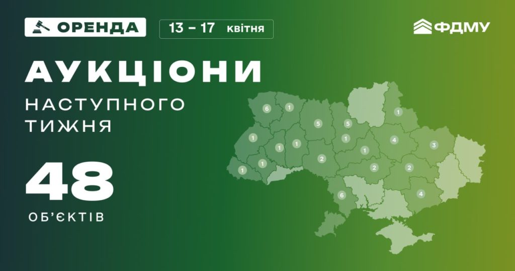 Наступного тижня, з 13 по 17 квітня, Фонд держмайна планує провести 48 аукціонів з оренди. Вони заплановані у Києві, Волинській, Одеській, Житомирській, Запорізькій, Полтавській, Харківській, Вінницькій, Дніпропетровській, Кіровоградській, Закарпатській, Івано-Франківській, Львівській, Київській, Рівненській, Сумській, Тернопільській, Хмельницькій, Черкаській областях.