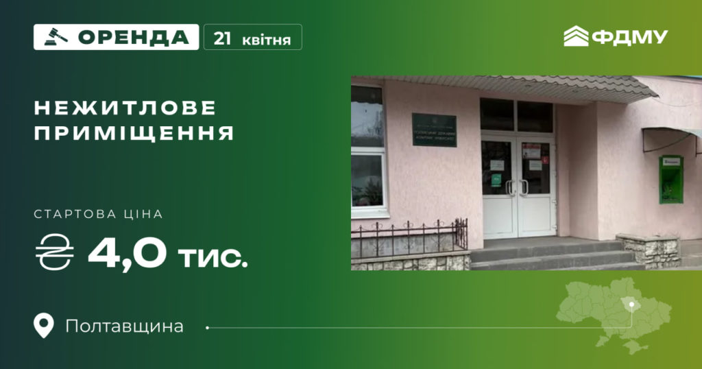 Фонд держмайна запрошує 21 квітня взяти участь в аукціоні з оренди нежитлового приміщення в Полтаві.