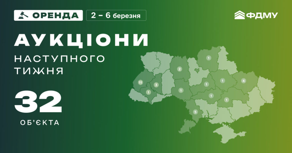 З 2 по 6 березня Фонд держмайна планує провести 32 онлайн-аукціони з оренди державного майна.
