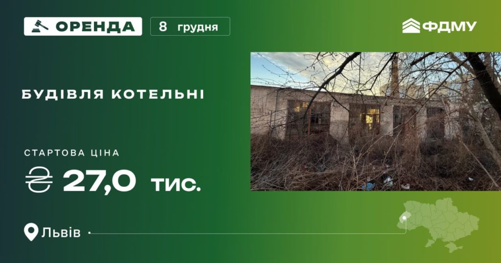 Фонд держмайна запрошує 8 грудня взяти участь в аукціоні з оренди будівлі котельні у Львові. Стартова ціна оренди складає 27,0 тис. грн. Загальна площа активу — 708,6 м². Актив знаходиться…